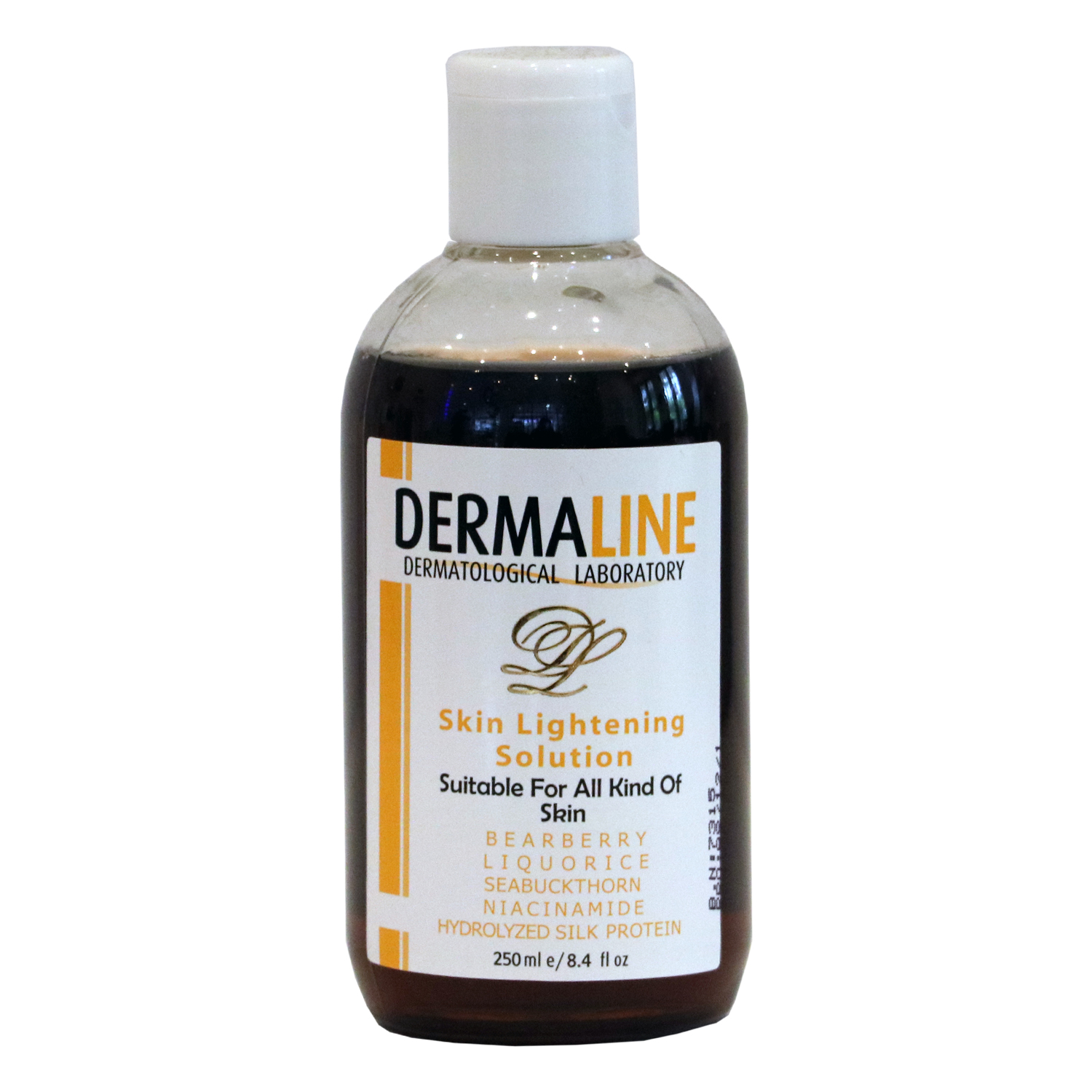 DERMALINE Skin Lightening Solution ساخت کشور: ایران با همکاری شرکت SEPPIC فرانسه و موسسه تحقیقات صنعتی بیوتکنولوژی KFG محلول روشن کننده درمالاین پوست را به خوبی پاکسازی کرده و به کاهش لک های پوست و روشن شدن پوست کمک می کند، سلول های مرده پوست را از بین برده و آثار باقیمانده از آرایش و آلودگی را از پوست حذف می کند که این امر باعث شادابی و طراوت پوست می گردد و پوست را آماده پذیرش بقیه محصولات مراقبتی می کند. این محصول بدلیل بافت سبکی که دارد احساس خنکی و طراوت به پوست می دهد.